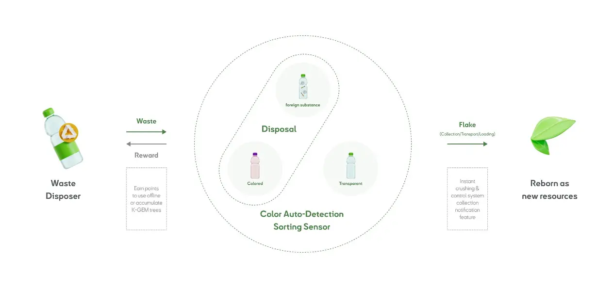MediCubo is a system that innovatively improves PET bottle recycling, using the following mechanisms to secure high-quality flakes.